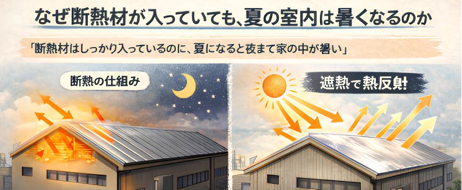 断熱材は「熱の伝わりを遅らせる」ものですが、遮熱材は「熱そのものを反射する」ものです。この違いが、夏の猛暑対策において大きな差を生みます。