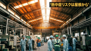 輻射熱は、空気を温めるだけでは止めにくい熱の入り方で、特に金属屋根の工場や天井が高い建屋で影響が大きくなります。