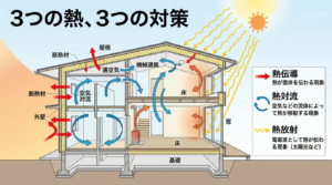 •太陽光による壁や屋根の加熱:夏場、太陽からの日射によって外壁や屋根が加熱され、その熱が放射によって室内に伝わります。