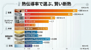 様々な建築材料は、その組成や構造によって熱伝導率が大きく異なります。一般的に、金属は熱を伝えやすく(熱伝導率が高い)、空気は熱を伝えにくい(熱伝導率が低い)という性質があります。この特性を理解することが、適切な材料選定の第一歩となります。