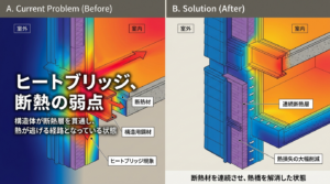 •不快感:ヒートブリッジ部分からの冷気や熱気によって、室内に温度ムラが生じ、居住者に不快感を与えます。