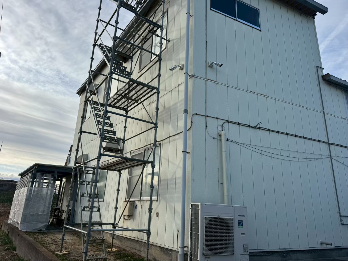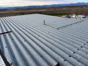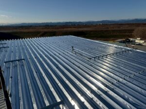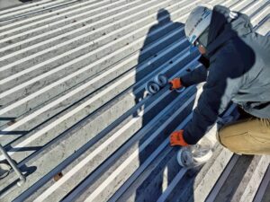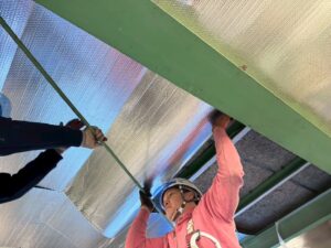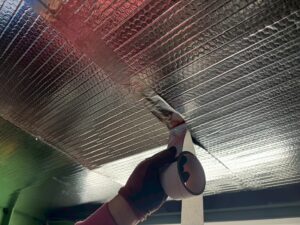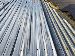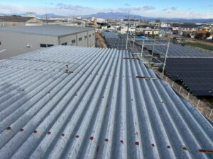 折板屋根に対して遮熱シートを用いたスカイ工法にて施工を実施しました。スカイ工法は専用の接着テープを用いて既存屋根へ直接施工する特許工法で、屋根面で太陽からの熱を反射し、建物内部への熱の侵入を抑制します。